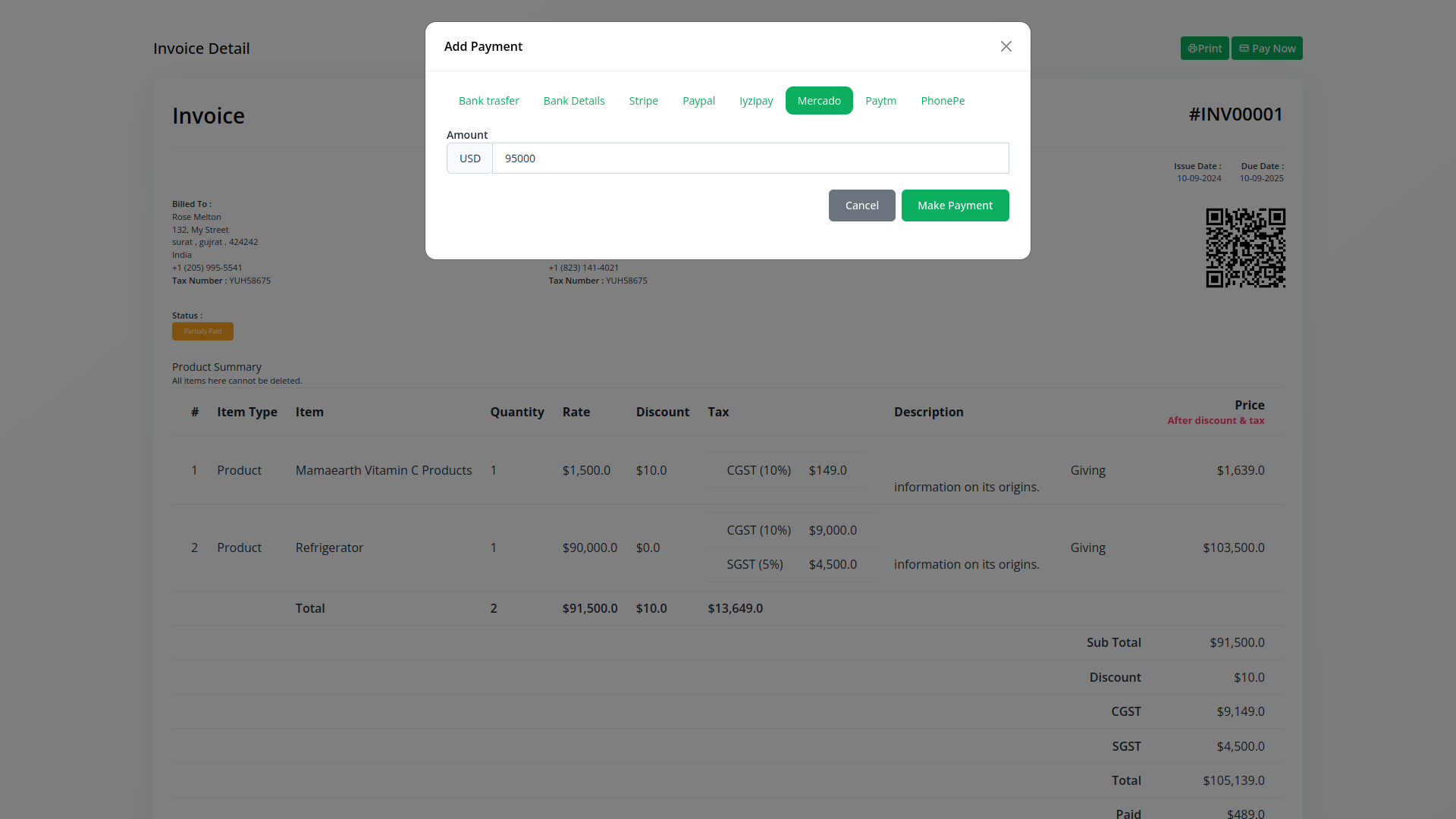 Mercado Pago is an online payment platform that allows Zoho Invoice users to receive and process payments quickly and securely. Once you share the invoice link with your customer, they can make payments through multiple payment modes such as debit/credit cards, cash, and red link transfers.